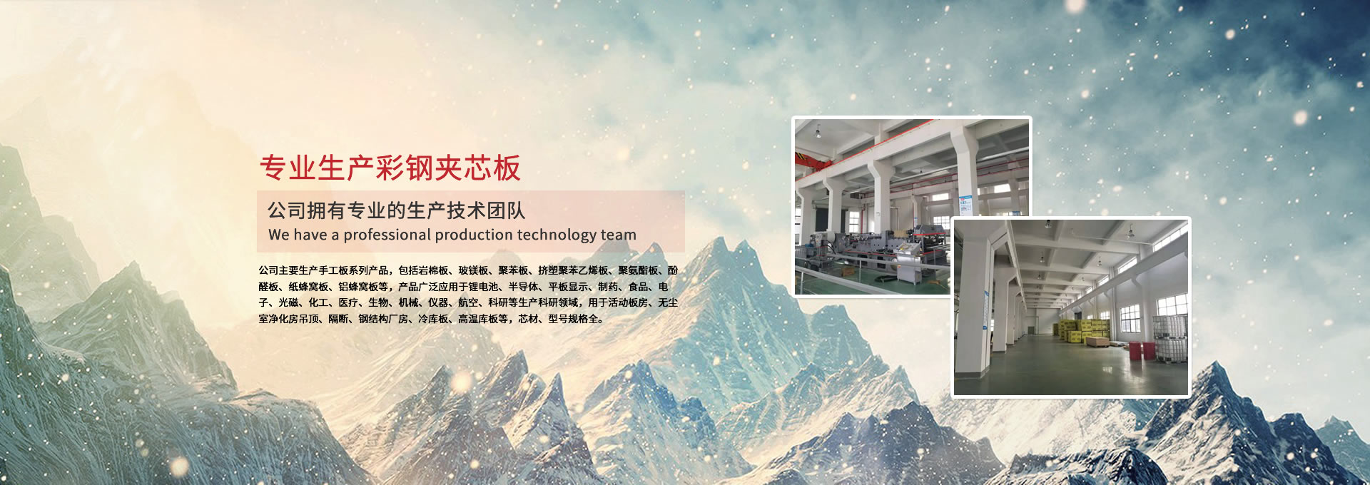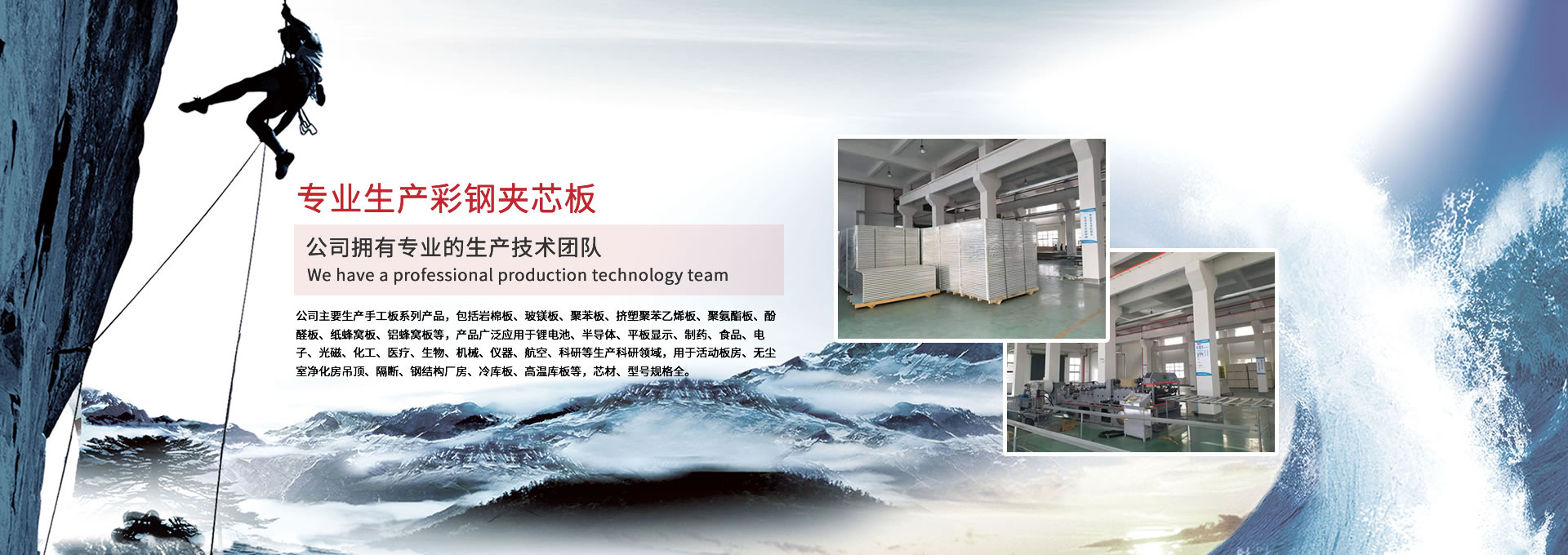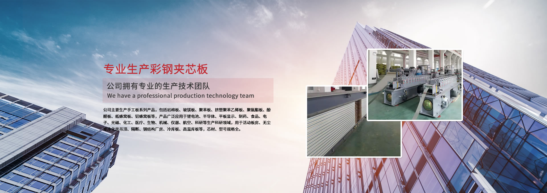 公司主要生產(chǎn)手工板系列產(chǎn)品,包括巖棉板、玻鎂板、聚苯板、擠塑聚苯乙烯板、聚氨酯板、酚醛板、紙蜂窩板、鋁蜂窩板等,產(chǎn)品廣泛應(yīng)用于鋰電池、半導(dǎo)體、平板顯示、制藥、食品、電子、光磁、化工、醫(yī)療、生物、機(jī)械、儀器、航空、科研等生產(chǎn)科研領(lǐng)域,用于活動板房、無塵室凈化房吊頂、隔斷、鋼結(jié)構(gòu)廠房、冷庫板、高溫庫板等,芯材、型號規(guī)格全。 公司擁有專業(yè)的生產(chǎn)技術(shù)團(tuán)隊(duì),周到的服務(wù)保證,以“質(zhì)量至上、信譽(yù)至上、服務(wù)至上”為宗旨,為用戶提供合格的產(chǎn)品和滿意的服務(wù),歡迎各界朋友參觀、指導(dǎo)!公司竭誠希望與各界朋友建立廣泛聯(lián)系,加強(qiáng)相互合作、共同發(fā)展!